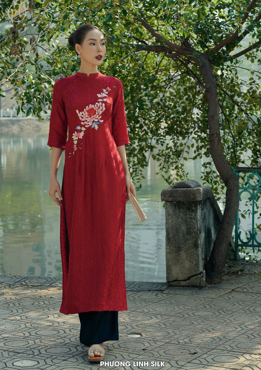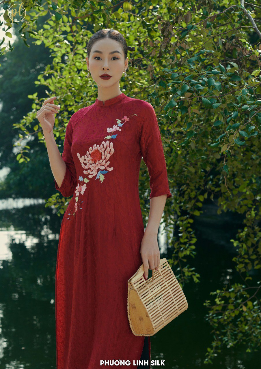 Màu đỏ là tượng trưng của may mắn. Tết này chị em xúng xính áo dài đỏ thì chẳng còn gì tuyệt vời hơn. Chất liệu lụa mềm mại của áo dài sẽ khiến nàng trở nên sang hơn. Dáng áo không ôm sát đồng thời không quá lùng bùng vừa giúp giấu eo to, vừa tôn dáng triệt để.