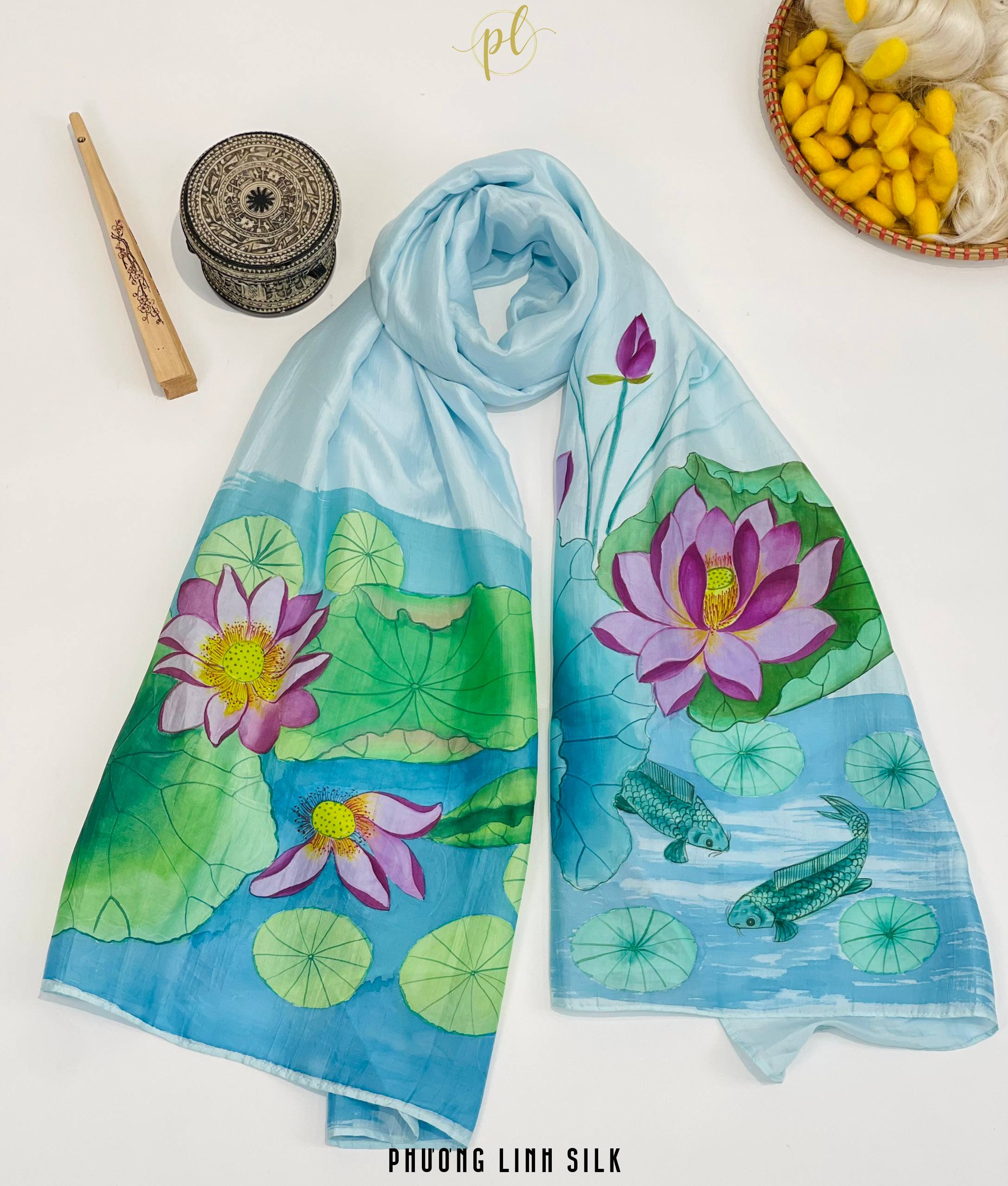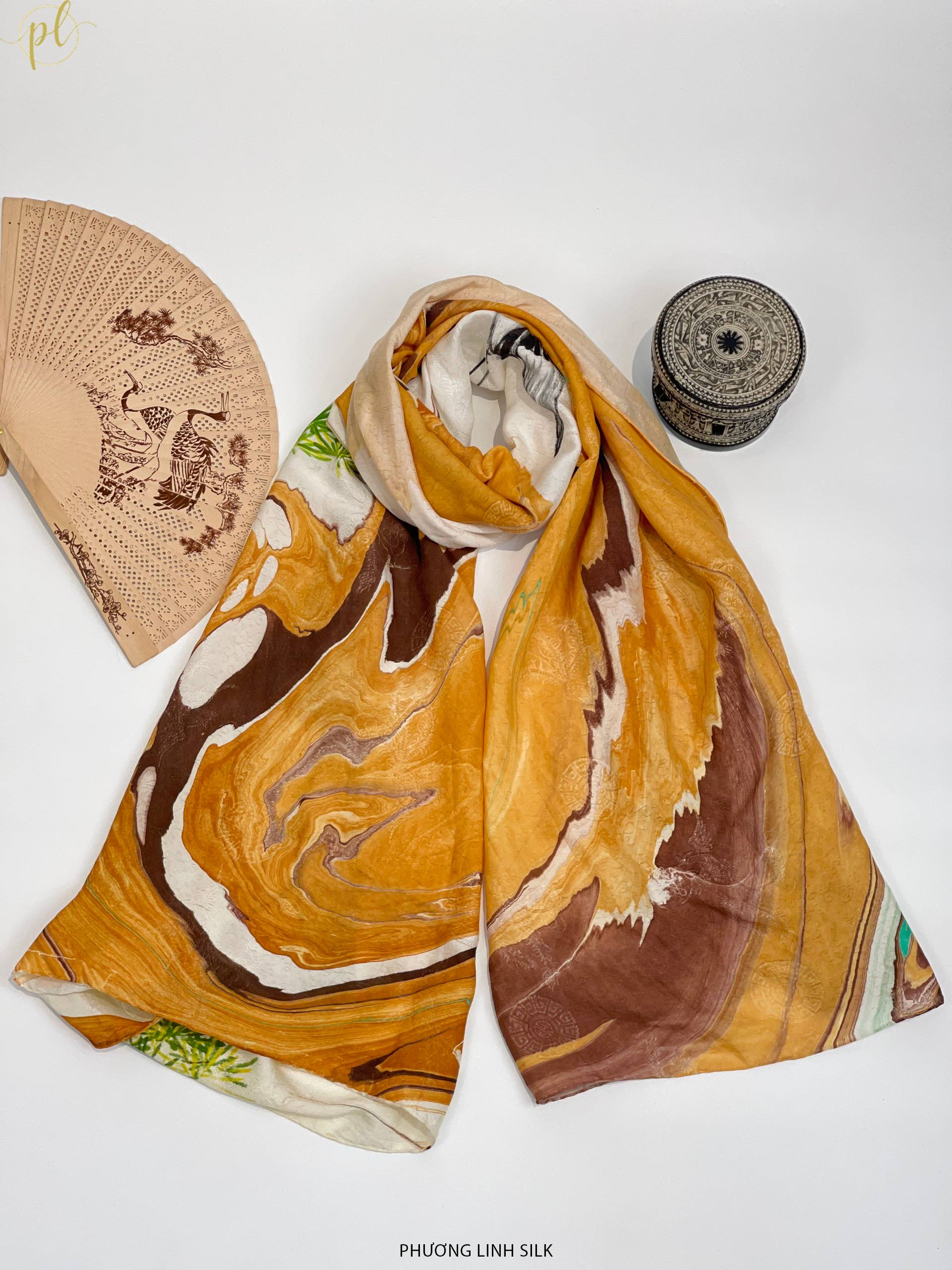 Đẳng cấp nhất khi nhắc về khăn lụa có lẽ phải gọi tên dòng khăn lụa thuỷ ấn. Thuỷ ấn là một thuật ngữ nghe có vẻ xa lạ nhưng nó là tượng trưng cho một loại nghệ thuật tinh tế và đẹp mắt, thể hiện sự khéo léo của nghệ sĩ trong việc sử dụng mực và nước để thể hiện tâm hồn và ý nghĩa trong từng bức tranh. Đây còn là một kĩ thuật cao cấp đòi hỏi người nghệ nhân phải cực kỳ tỉnh táo và sáng tạo để hoàn thành trọn vẹn được tác phẩm. Vậy nên không khó đoán khi đây là dòng khăn cao cấp nhất và có giá thành cao nhất thời điểm hiện tại (3.800.000 - 7.280.000)