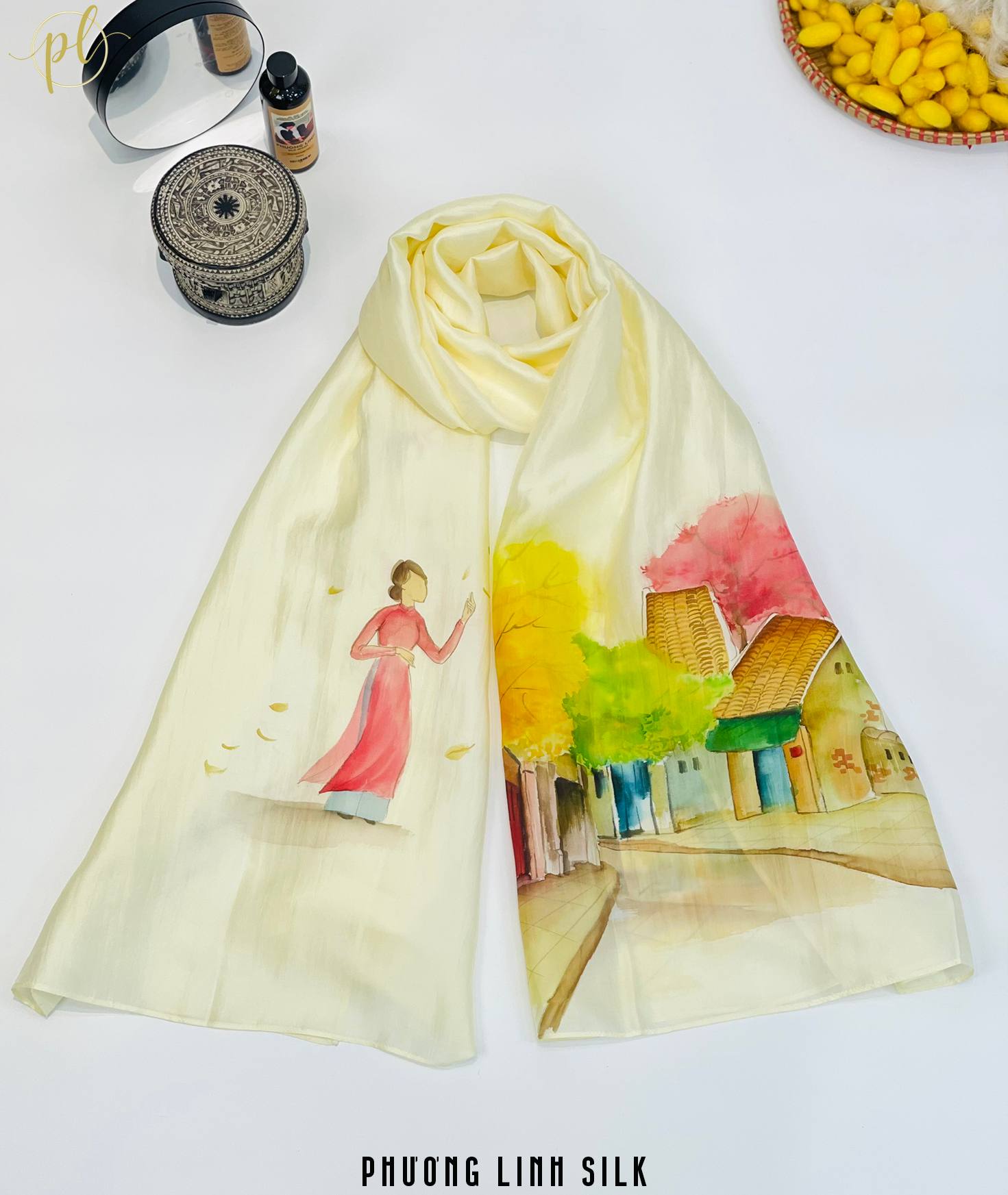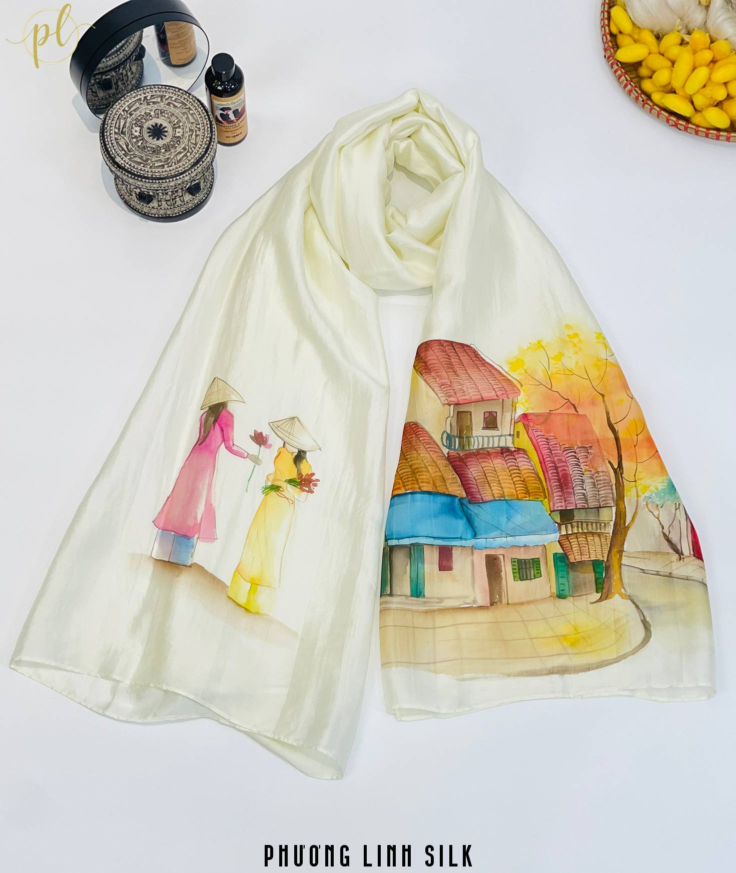 Có điều kiện hơn một chút thì mọi người có thể ưu tiên lựa chọn các mẫu khăn lụa có hoạ tiết vẽ tay truyền thống như hoa sen hay phố xá. Bởi để hoàn thành được một tác phẩm hình vẽ trên nền khăn lụa thì người nghệ nhân đã phải rất tỉ mỉ và bỏ nhiều thời gian cũng như công sức để hoàn thành. Vì vậy mỗi mẫu khăn sẽ là một độc bản khác nhau, mang lại giá trị về vật chất và tinh thần vô cùng cao. Điều đó đã góp phần nâng tầm vị thế của khăn lụa vẽ khi giá trị của nó không hề thấp (1.520.000 - 2.520.000)