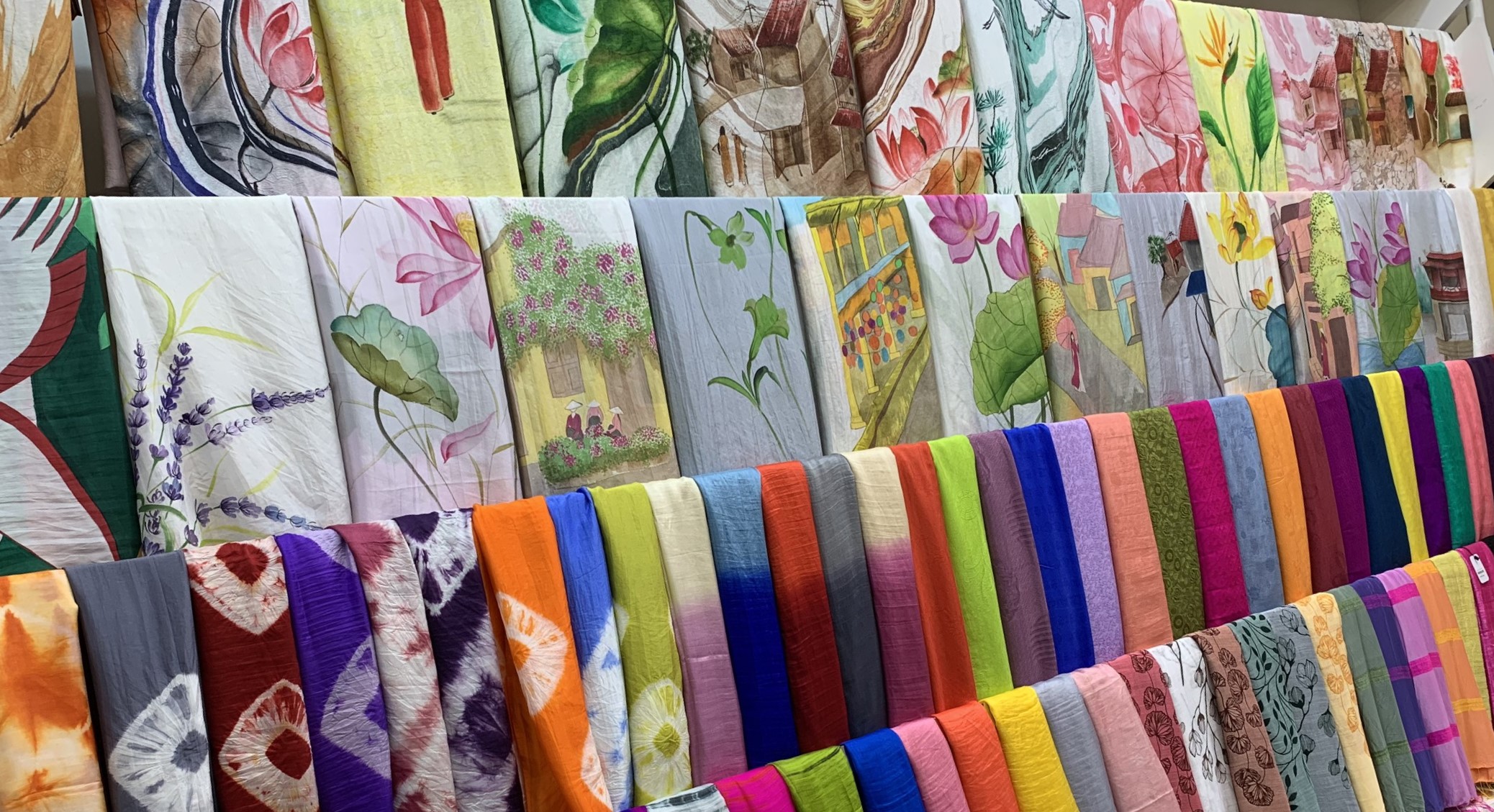 Sự pha trộn những tông màu sắc, nổi bật có, trầm lắng có tưởng chừng như không thể hòa hợp được. Tuy nhiên qua những đôi bàn tay khéo léo, tinh tế của nguời nghệ nhân những mẫu khăn lụa loang từ lụa tơ tằm lại trở lên độc đáo vô cùng .