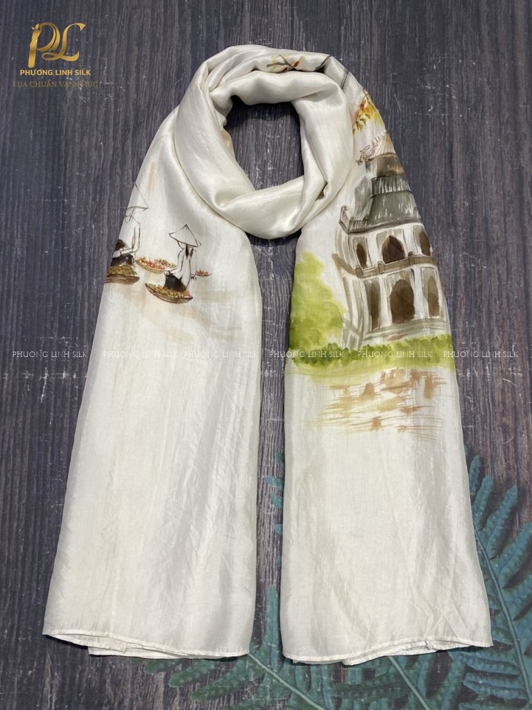 Khăn lụa vẽ màu nước được làm từ tơ tằm 100% và được vẽ tay hoàn toàn bởi hoạ sỹ có tay nghề cao, lâu năm. Khi chạm bề mặt khăn có cảm giác mướt và mịn, hình vẽ sinh động. Mỗi một chiếc khăn cần từ 25 - 30 ngày để hoàn thành .