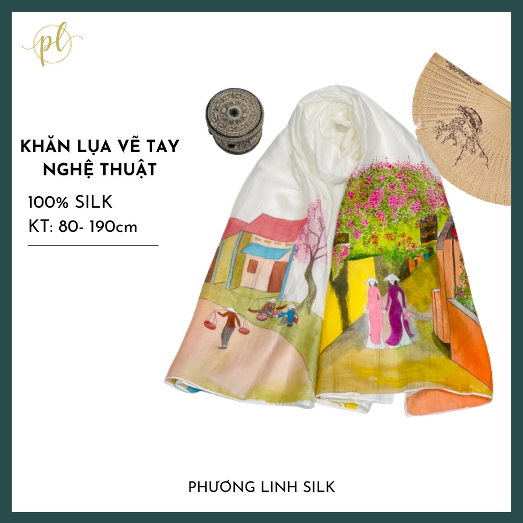 Khăn lụa vẽ màu nước được làm từ tơ tằm 100% và được vẽ tay hoàn toàn bởi hoạ sỹ có tay nghề cao, lâu năm. Khi chạm bề mặt khăn có cảm giác mướt và mịn, hình vẽ sinh động. Mỗi một chiếc khăn cần từ 25 - 30 ngày để hoàn thành .