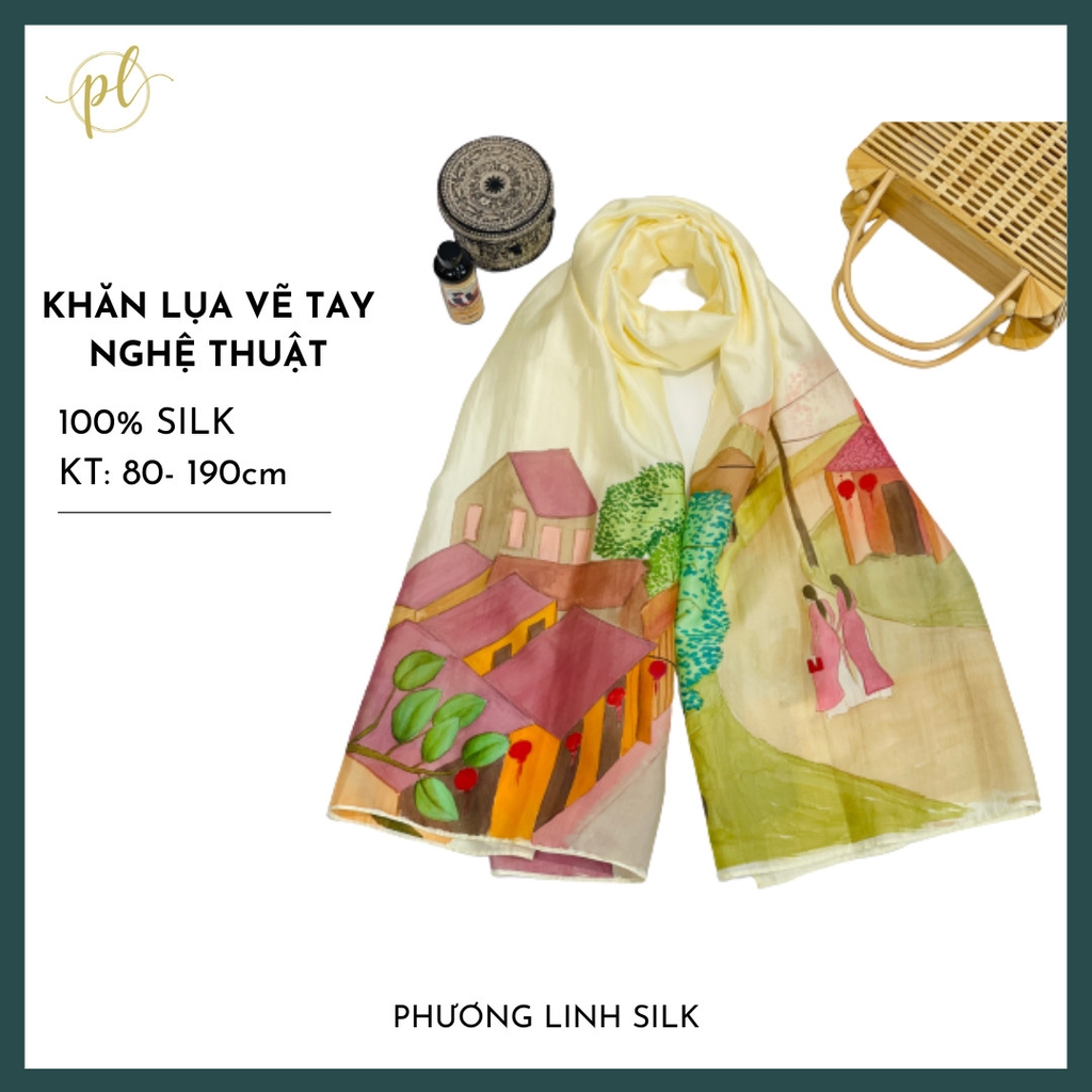 Khăn lụa vẽ màu nước được làm từ tơ tằm 100% và được vẽ tay hoàn toàn bởi hoạ sỹ có tay nghề cao, lâu năm. Khi chạm bề mặt khăn có cảm giác mướt và mịn, hình vẽ sinh động. Mỗi một chiếc khăn cần từ 25 - 30 ngày để hoàn thành .