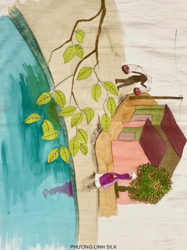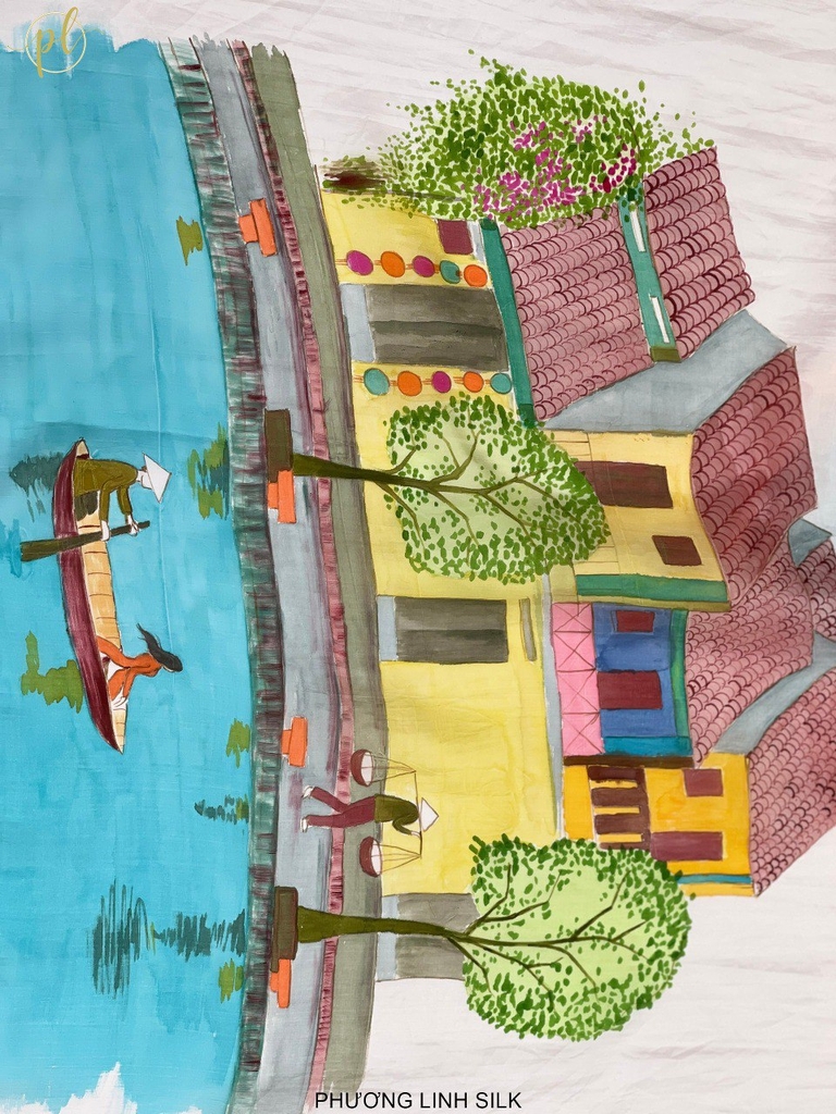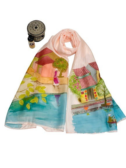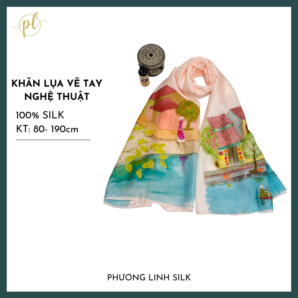Khăn lụa vẽ màu nước được làm từ tơ tằm 100% và được vẽ tay hoàn toàn bởi hoạ sỹ có tay nghề cao, lâu năm. Khi chạm bề mặt khăn có cảm giác mướt và mịn, hình vẽ sinh động. Mỗi một chiếc khăn cần từ 25 - 30 ngày để hoàn thành .