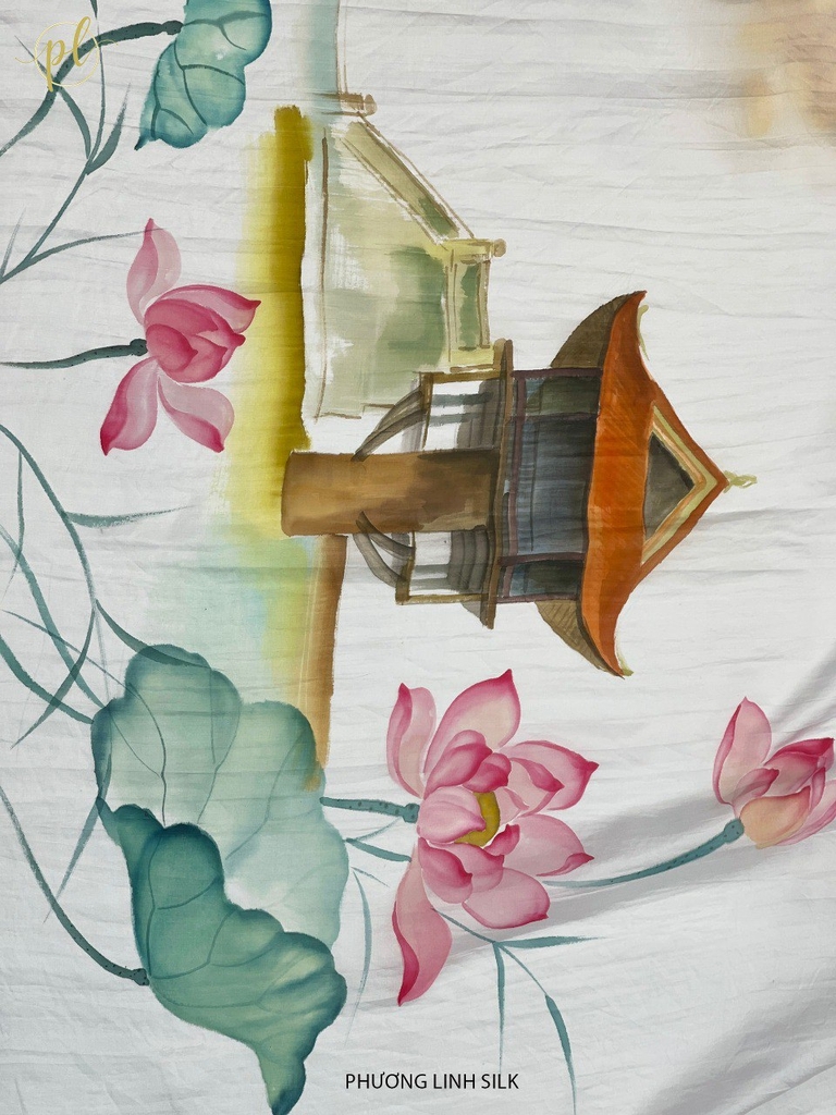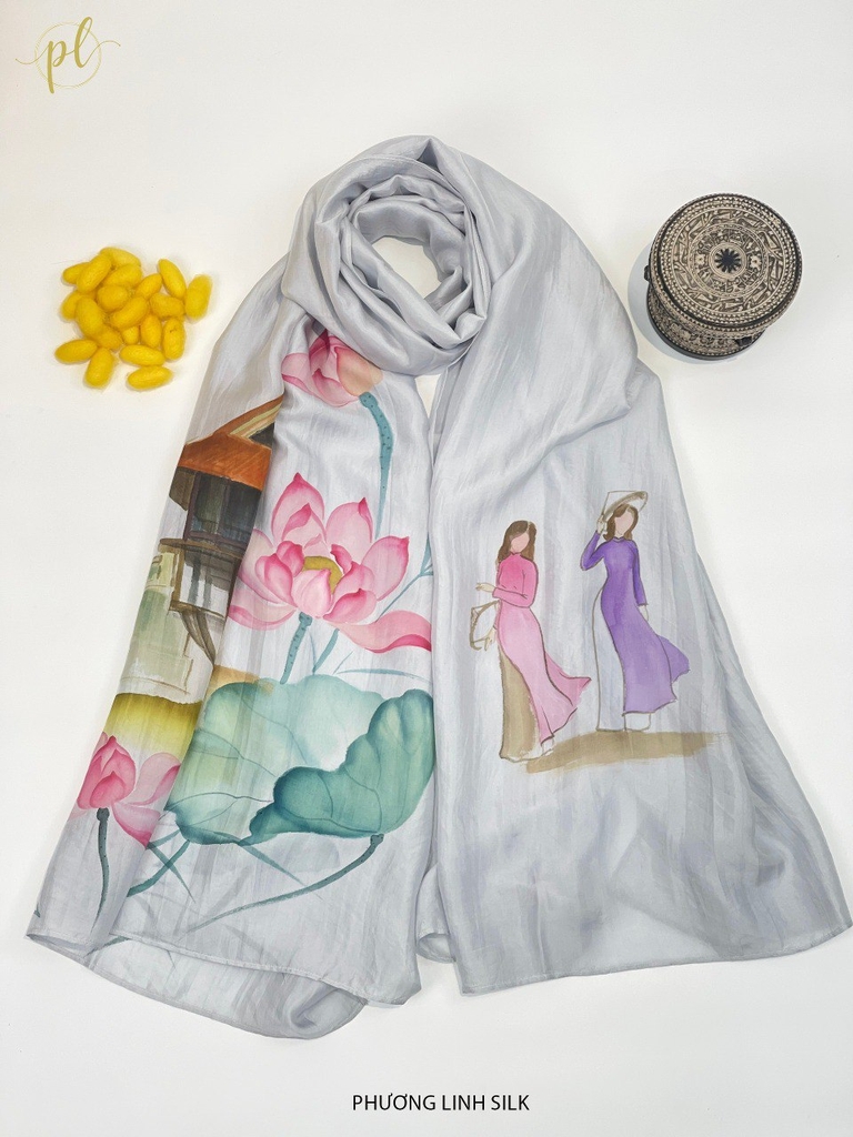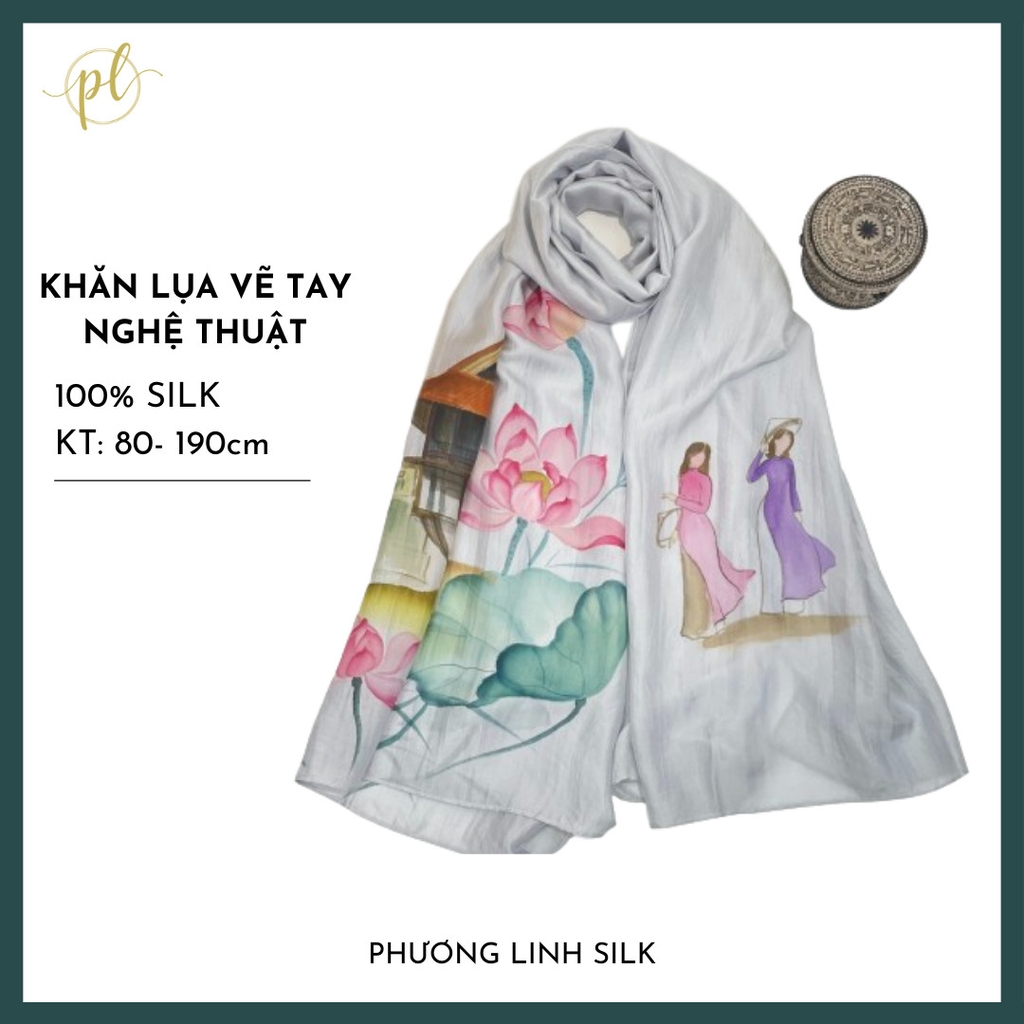 Khăn lụa vẽ màu nước được làm từ tơ tằm 100% và được vẽ tay hoàn toàn bởi hoạ sỹ có tay nghề cao, lâu năm. Khi chạm bề mặt khăn có cảm giác mướt và mịn, hình vẽ sinh động. Mỗi một chiếc khăn cần từ 25 - 30 ngày để hoàn thành .