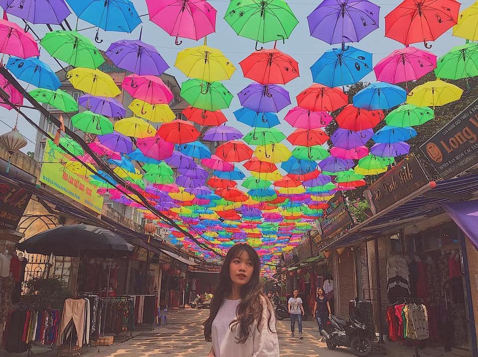 Ngay khi đặt chân đến cổng làng sẽ thấy được vẻ cổ kính hiện ra ngay trước mắt. Qua cổng những chiếc ô xanh đỏ tím hồng trải dài suốt gần 100 m làm nổi bất lên cả một khoảng trời rực rỡ sắc màu. Nếu đi cũng bạn hay gia đình thì hay check - in ngay một kiểu sống ảo với hàng ô trải dài tít tắm đảm bảo sẽ vô cùng xịn xỏ luôn đó.