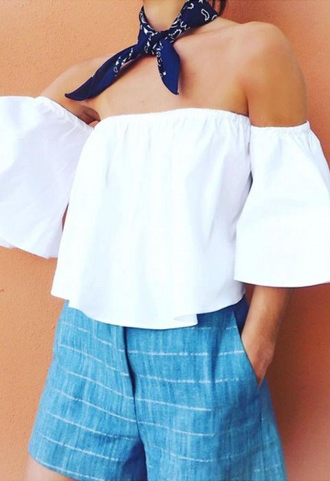 Kết hợp một chiếc khăn lụa tơ tằm buộc cổ với áo trễ vai - điểm nhấn ngây thơ cho set đồ quyến rũ.